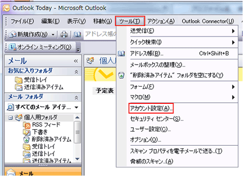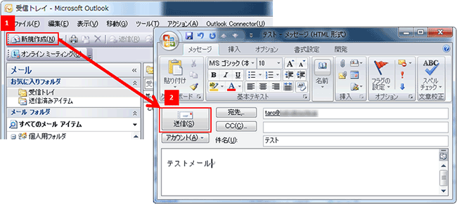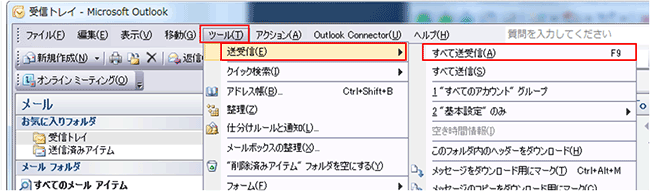 受信のテスト : [ツール]→[送受信]→[すべて送受信]