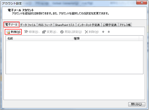 2. [アカウント設定]が表示されますので、[電子メール]→[新規]を選択します。