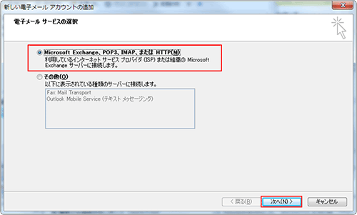 [Microsoft Exchange、POP3、IMAP、または HTTP(M)]を選択し、[次へ]をクリックします。