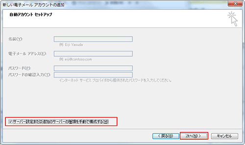 3. [サーバー設定または追加のサーバーの種類を手動で構成する]にチェックをつけ[次へ]を選択します。