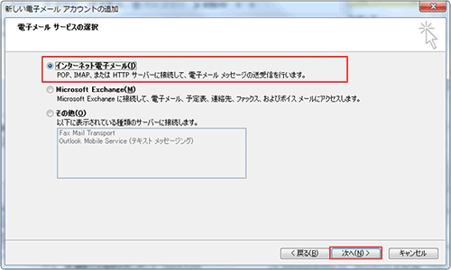 [メール サービスの選択]画面が表示されますので、[インターネット電子メール]を選択し、[次へ]をクリックします。
