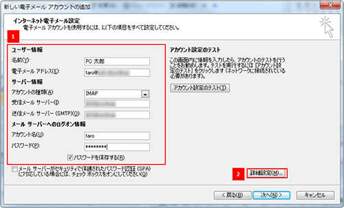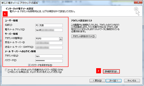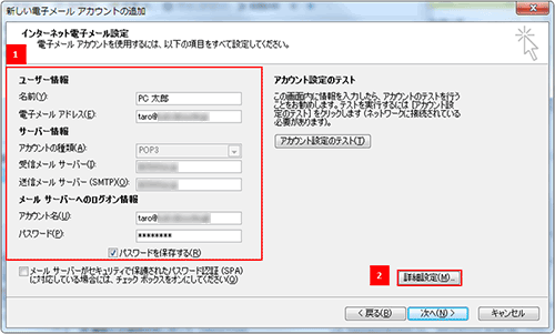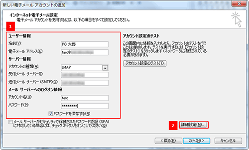 アカウント名 お客さまが設定したメールアカウント (例: taro、adminなど)