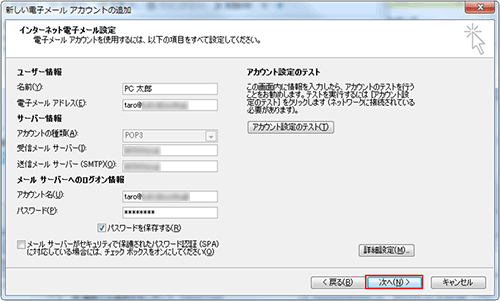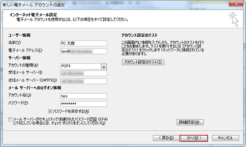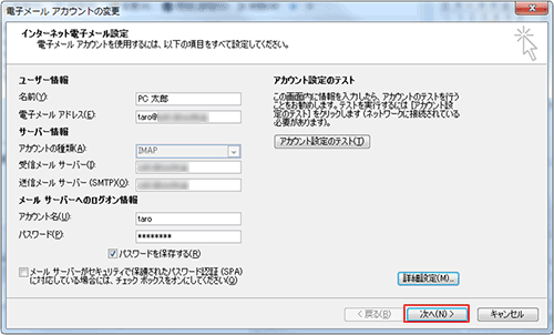 6. [インターネット電子メール設定]画面が再度表示されますので、[次へ]を選択します。
