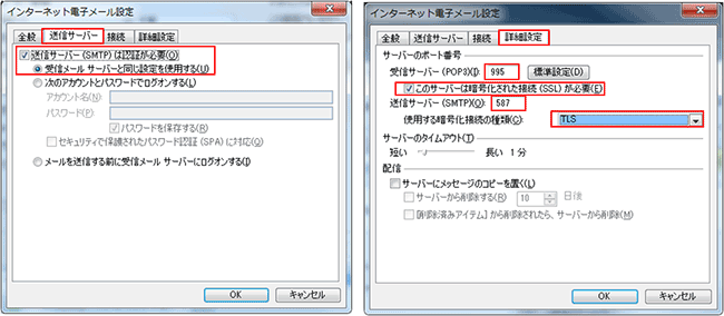 暗号化ありの設定 (POP over SSL/SMTP STARTTLS)