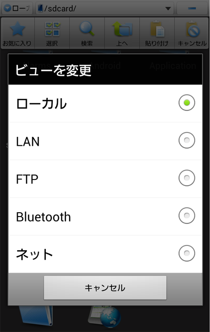 - ESファイルエクスプローラ を起動し、左上のタブから「FTP」ビューを表示させます。
