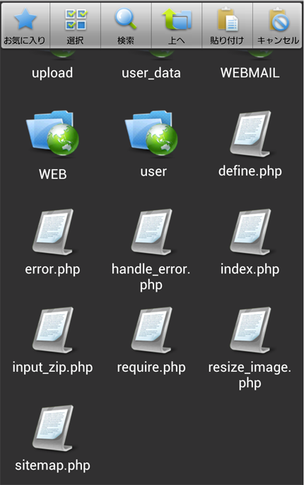 アップロードさせたいファイルの置き場へ移動し(ここではローカルフォルダに保存してあるindexファイルを対象とします)左上のタブから「ローカル」を選択し、index.htmlファイルを長押しします。