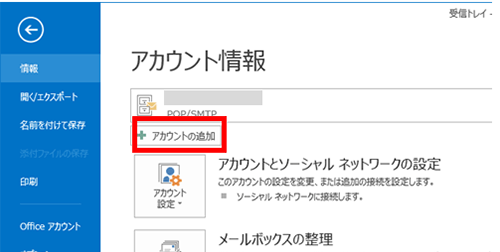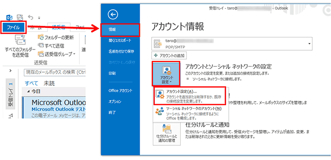 設定内容を確認する場合は、[ファイル]→[情報]→[アカウント設定]をクリックしてください。