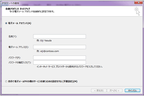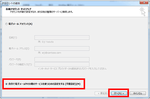 - 「自分で電子メールやその他のサービスを使うための設定をする」を選択し、[次へ]をクリックします。
