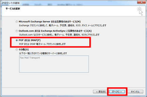 - 「POP または IMAP」を選択、[次へ]をクリック。