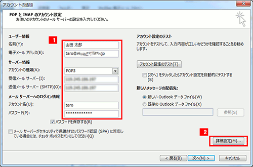 アカウント名 お客さまが設定したメールアカウント (例: taro、adminなど) パスワード お客さまが設定したパスワード - 「インターネット電子メール設定」の「送信サーバー」、「詳細設定」タブをクリックし、