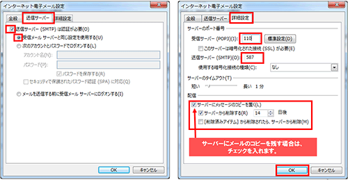 送信サーバーは認証が必要 チェック 受信メールサーバーと同じ設定を使用する 選択 詳細設定
