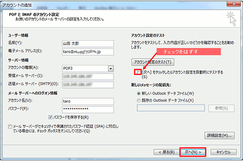 正しい設定でもエラーになる場合があります。ここでは、自動テストは行わず、最後に、送信、受信テストを別途実施することをお勧めいたします。