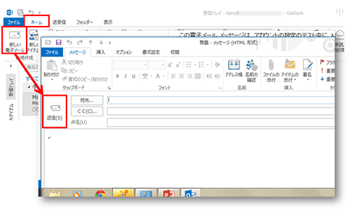 [ホーム]→[新しい電子メール]をクリックしメールを作成します。