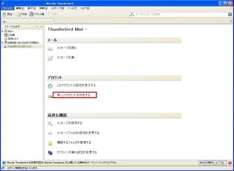 - Thunderbird3.xを起動し、「アカウント」の「新しいアカウントを作成する」をクリックします。