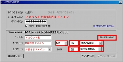 ユーザ名にはアカウント名@お客さまドメイン、受信サーバ、送信サーバはホストサーバ名をご指定ください。