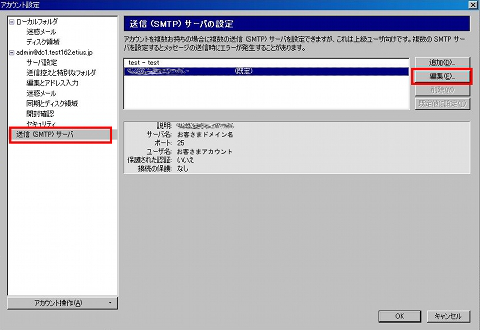 - 送信(SMTP)サーバから設定ののサーバを選択し、「編集」をクリックします。