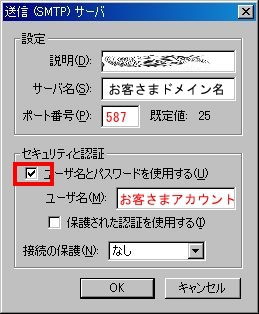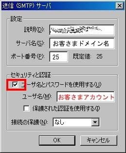 - 「セキュリティと認証」の「ユーザ名とパスワードを使用する(U)」にチェックを入れ、「ユーザ名」に 「お客さまアカウント」を記入します。
